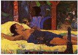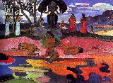 Eugène-Henri-Paul Gauguin (Paris June 7, 1848 - May 9, 1903, Atuona, Hiva Oa, Marquesas Islands) was a Symbolist/Post-Impressionist) painter/sculptor. He was born in France and died in French Polynesia. one of the leading French painters of the Postimpressionist period, whose development of a conceptual method of representation was a decisive step for 20th-century art. After spending a short period with Vincent van Gogh in Arles (1888), Gauguin increasingly abandoned imitative art for expressiveness through colour. From 1891 he lived and worked in Tahiti and elsewhere in the South Pacific. His masterpieces include the early "Vision After the Sermon" (1888) and "Where Do We Come From? What Are We? Where Are We Going?" (1897-98). Gauguin’s artistic development of a conceptual method of representation was important for the history of art as it moved into the twentieth century. The name for the movement was called by Jean Moreas Symbolism, “ as the only name capable of giving a reasonable definition of the present trend of the creative in spirit in art.” Its essential character was, “to clothe an idea in a visible form.” Although his main achievements were to lie elsewhere, Gauguin was, to use a fanciful metaphor, nursed in the bosom of Impressionism. His attitudes to art were deeply influenced by his experience of its first exhibition, and he himself participated in those of 1880, 1881 and 1882. The son of a French journalist and a Peruvian Creole, whose mother had been a writer and a follower of Saint-Simon, he was brought up in Lima, joined the merchant navy in 1865, and in 1872 began a successful career as a stockbroker in Paris. Painters no longer aimed at depicting the outer world but at rendering their inner dreams by symbolic allusion and decorative form. Line and color developed their powers of expression, taking inspiration in global art from Japanese art prints to primitive African art.