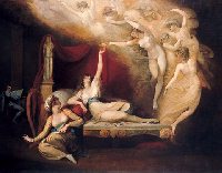 Henry Fuseli (1741-1825) Swiss painter, poet, critic, and teacher, a fervent admirer of Shakespeare, who spent most of his active career in England. Fuseli has often been regarded as a forerunner of the Romantic art movement and a precursor of Symbolism and Surrealism. His most famous painting is The Nightmare (1781), in which an ape-like goblin sits on a young woman, who is sleeping in a strained posture. The only man that ever I knew Henry Fuseli was born Johann Heinrich Füssli in Zürich into a family of artists and writers. His father was the portrait painter and art historian Johannes Kaspar Füssli. Although Fuseli's brothers and sisters became artists, his father directed him towards priesthood. He studied theology at Caroline College in Zurich, where he was taught by Professor J.J. Bodmer, an early promoter of the Sturm und Drang movement in Switzerland. Later Fuseli portrayed him an a work entitled The Painter in Conversation with Johann Jakob Bodmer (1778-81). Fuseli was ordained a Zwinglian clergyman in 1761. Next year, in consequence of a pamphlet, in which he attacked Felix Grebel, the corrupted administration of a magistrate, he had to leave Zurich. Fuseli's fellow-polemicist, the theologian Johann Casper Lavater, later descibed his energetic friend: "His spirits are hurricane, his servants flames of fire. He goes on the wings of the wind. His laugh is the mockery of Hell, and his love a murderous lightning flash." Fuseli traveled through Germany, and spent then much time in Berlin. There worked on a German translation of Lady Mary Wortley Montagu's Letters, which was published in 1763. Lavater and Fuseli remained friends. Fuseli's translation of Lavater's Aphorisms on Man appeared in 1788. He also illustrated the original German and French editions of Lavater's Physiognomical Fragments. In 1764, Fuseli went to London to work as a translator of French, German, and Italian books. At the age of twenty-four, he translated into English Reflections on the Painting and Sculpture of the Greeks by the German Neo-Classical theorist J.J. Winkelmann. However, Fuseli did not become Winkelmann's follower. He also admired another great intellectual figure of the time, Jean-Jacques Rousseau, whom he met, but eventually broke with his ideas. Fuseli's book on the French philosopher, Remarks on the Writing and Conduct of J. J. Rousseau, was published anonymously in 1767. Fuseli was an active writer until 1768 without much success. Because he could not support himself by his pen, he served as a traveling tutor to the young Lord Chewton, a work which he did not like and which was much against his temperement. Fuseli had "the wildness of the warrior", as Lavater said, and a punch-up ended eventually his appointment. On the advice of the famous portrait painter Joshua Reynolds (1723-92), who encouraged Fuseli to devote himself to painting, he went in 1770 to Rome for eight years. There he abandoned Winkelmann's refined aestheticism-"noble simplicity and quiet grandeur" just was not his program. Fuseli taught himself, mainly by copying Michelangelo's frescoes in the Sistine Chapel and drawing from antique sculptures. Among Fuseli's most haunting works dealing with antique is The Artist in Despair over the Magnitude of Antique Fragments (1778-80), in which only a hand, pointing upwards, and a foot, have remained from a colossal statue (of Constantine the Great). Although Fuseli's technique was highly personal and experimental, his choice of themes influenced so much the other foreign artists in Rome, that he became virtually the leader of a school of painting. His circle included Alexander and John Runciman, the Swedish sculptor Johan Tobias Sergel, the English artist Thomas Banks, and the Danish painter Nicolas Abildgaard. "There is living in Rome a noble German from Zurich, Henry Fuseli," wrote Johann Herder in 1774 in a letter to Johann Hamann, "a genius like a mountain torrent, a worshipper of Shakespeare, and now, Shakespeare's painter." On his return to Zurich Fuseli painted The Oath of the Ruttli (1779-81), which was destined for the Town Hall. After his romance with Lavater's niece Anna Landolt failed, he left in 1779 for London. It is though that his best-known scene, The Nightmare, refers to this affair. A young woman is mounted by a demonic looking incubus; the monster literally is a burden on her heart. She lies in a sprawl, with her arm hanging down. A horse, the "night mare" gazes through the curtains with phosphorescent eyes, observing or leering. It has remained a puzzle, whose nightmare Fuseli portrays-it cannot be the woman's because she is part of the scene herself. It has been said, that the picture is an revenge for an unfulfilled desire, ultimately perhaps a manifestation of a jealous passion, in which the strange lover of the woman is reduced into a monster. The work became so popular that Fuseli painted several other versions on request. One version of The Nightmare was published in Erasmus Darwin's poem The Botanic Garden (1789-91). In France, The Nightmare inspired Charles Nodier's fantasy story Smarra, ou Les Démons de la nuit (1821). Fuseli himself was careful not to be tempted by "fancy" and the unknown, but believed in the possible, the probable, and the known-"our ideas are the offspring of our senses," he once said. A Sleeping Woman and the Furies (1821) took the sexual undertones even further. Now the woman is half-naked and her figure suggest that she has been violated. Another cruel fantasy was Wolfram Looking at his Wife, whom he has Imprisoned with the Corpse of her Lover (1812-20). From these and other works it has been concluded, that Fuseli was a misogynist and he feared and loathed dominant women. In 1788 Fuseli married Sophia Rawlins, whom he used as a model in a number of erotic and macabre paintings. In Mrs. Fuseli Seated by a Fireplace (1799) she was also referred in the figure of the feared Medusa; the sight of her head turned all living things into 